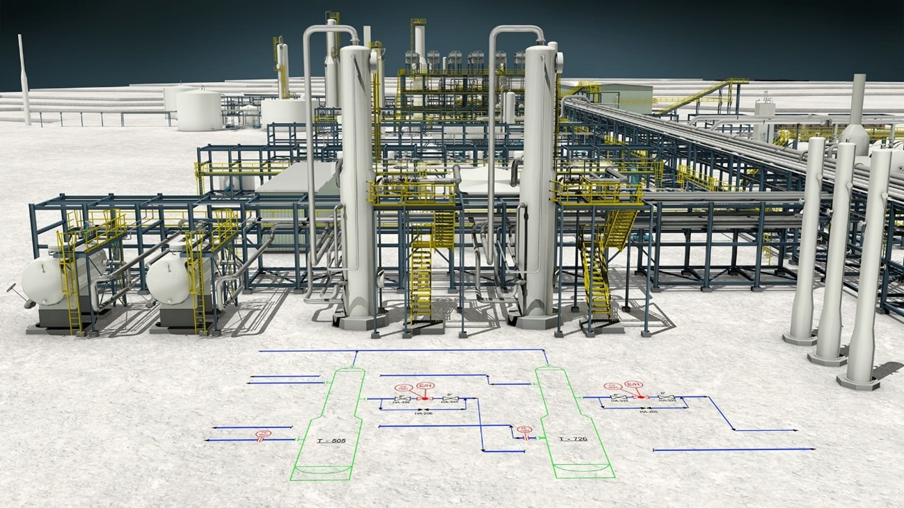 Imagem renderizada de uma refinaria de óleo e gás. Fonte: Autodesk.