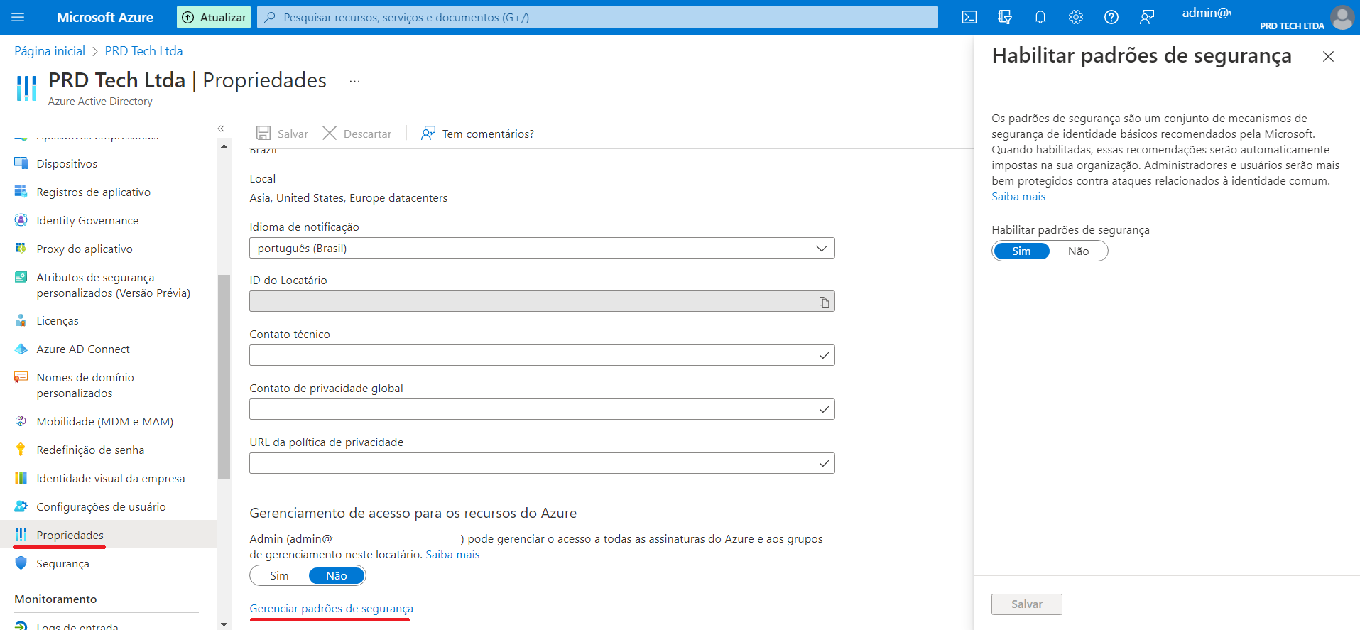 Portal do Azure → Azure Active Directory → Propriedades → Gerenciar padrões de segurança